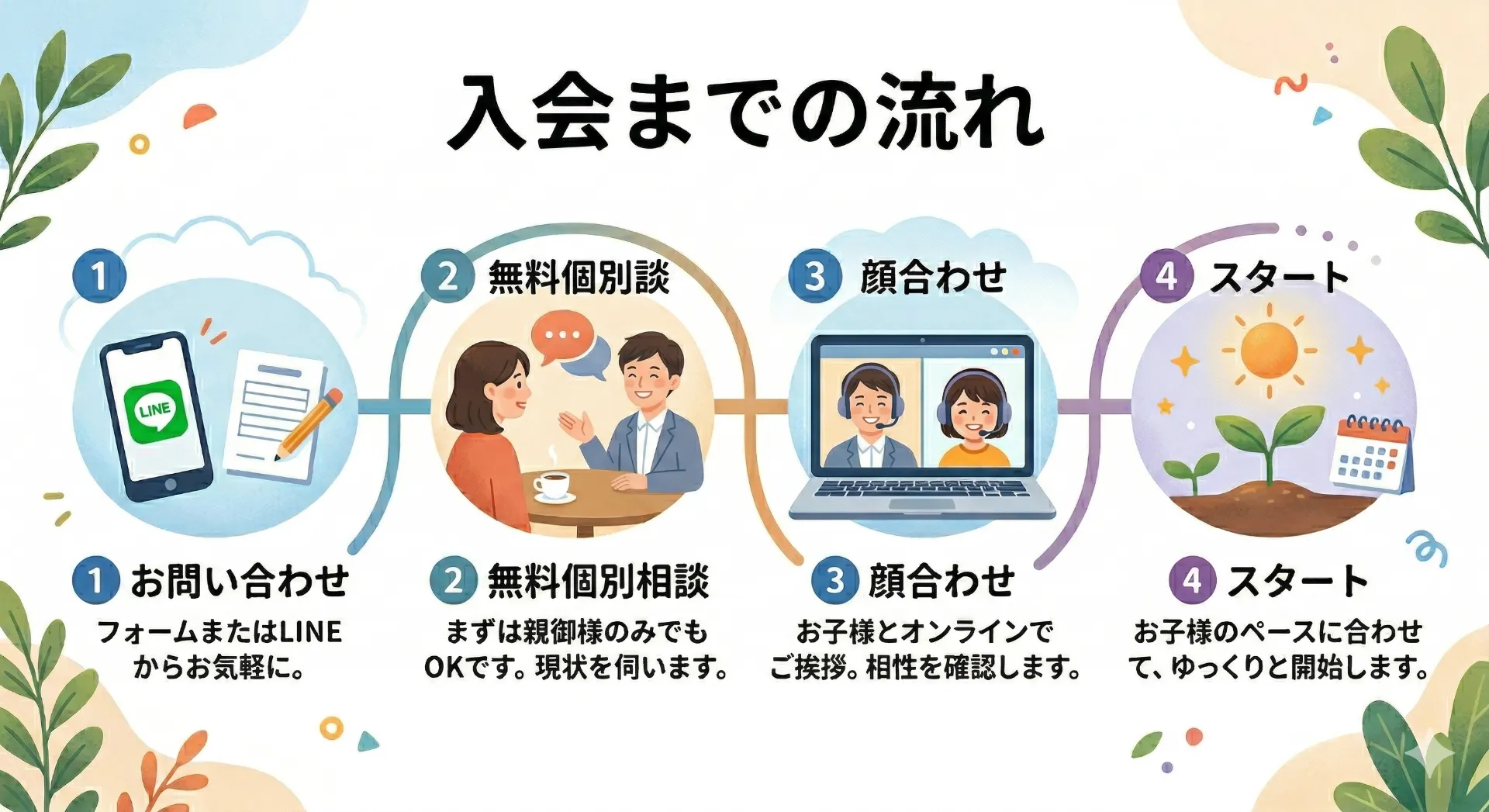 勉強が止まってしまうと、お子様は「もう戻れない」「周りに追いつけない」と自分を責め、ますます外の世界が怖くなってしまいます。 私たちは、そんな悪循環を断ち切るために「教えること」よりも「対話すること」を大切にしています。親でも先生でもない第三者の専門スタッフが、お子様の心の安全基地となり、少しずつ学習の火を灯します。